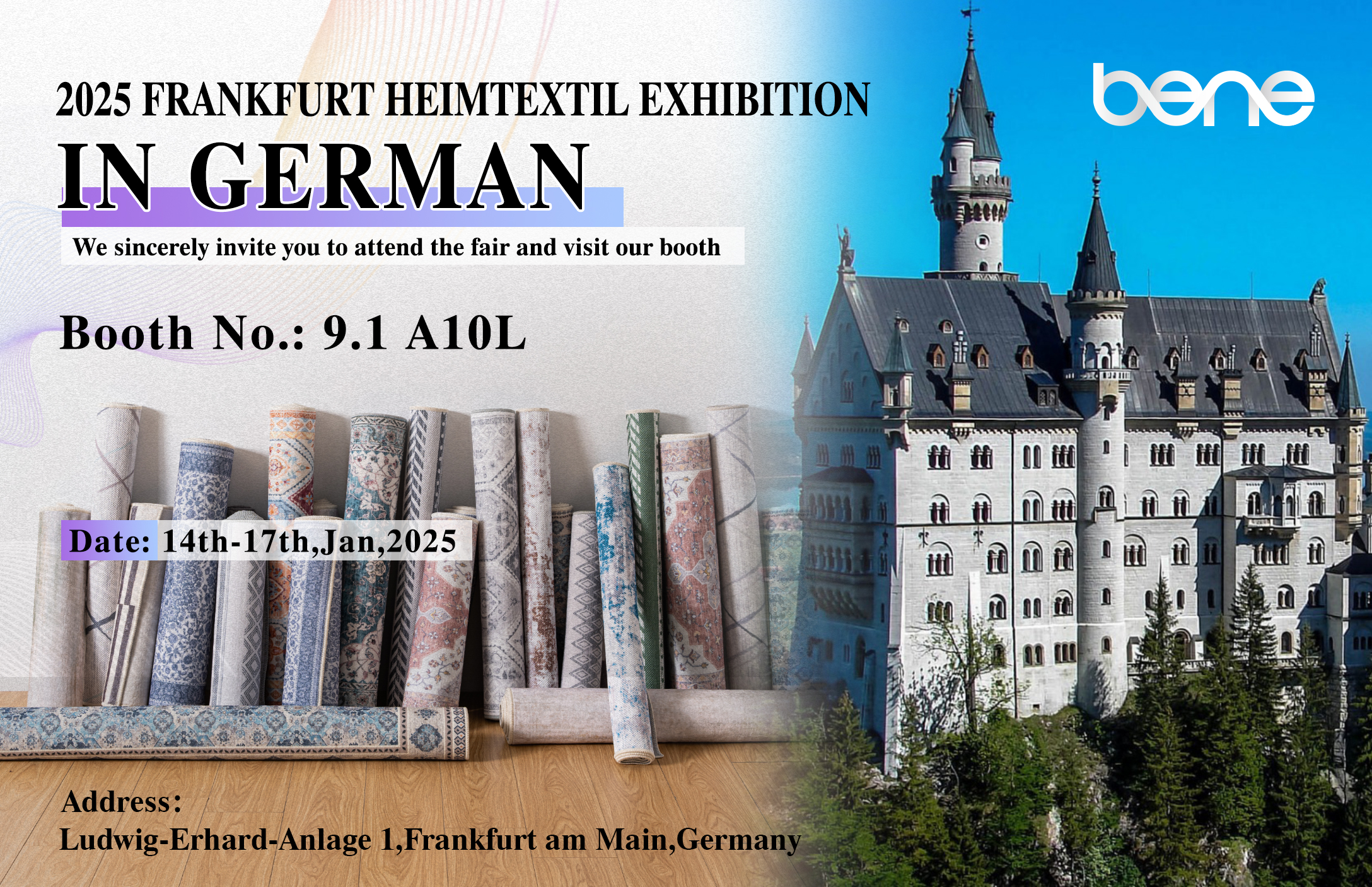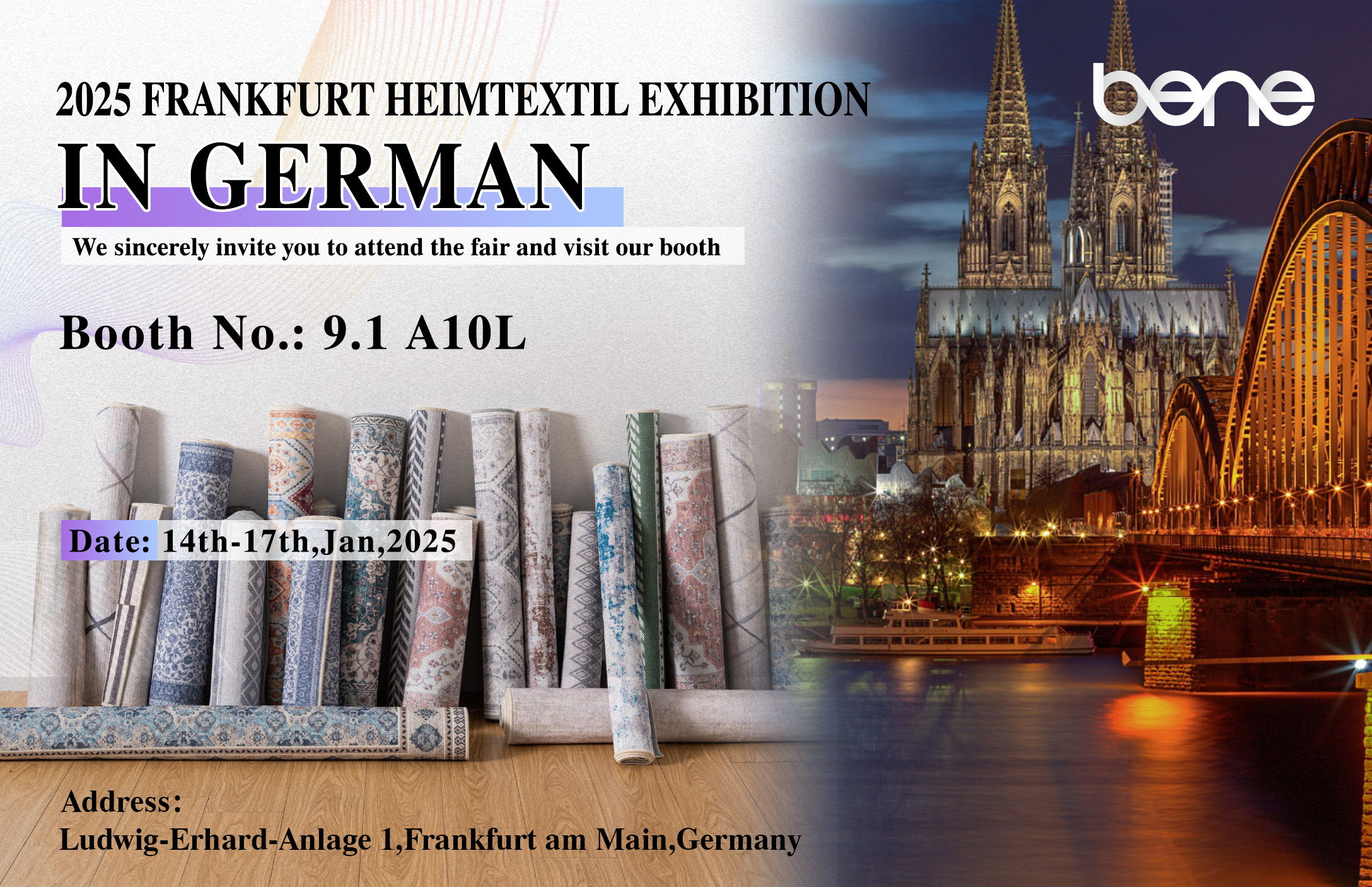 شرکت فناوری نساجی Zhejiang Benyi ، Ltd. ، یک شرکت پیشرو در زمینه نساجی نوآورانه ، مفتخر است که مشارکت ما را در نمایشگاه آینده Frankfurt Heimtextil آینده اعلام کند. این نمایشگاه از 14 تا 17 ژانویه 2025 برگزار می شود و ما آخرین فرش ها ، پارچه های فرش و محصولات نهایی خود را در غرفه شماره 9.1A10L به نمایش می گذاریم. ما صمیمانه از شما دعوت می کنیم تا از غرفه ما دیدن کنید و در مورد فن آوری های نوآورانه نساجی و روندهای صنعت با ما صحبت کنید.